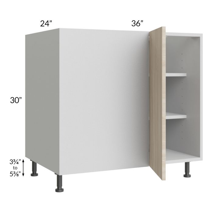 1 full height door blind base corner cabinet with no drawers and (2) 18" deep shelves. The actual width is 36", but the cabinet must be pulled at least 6" from the corner, taking up 42" of wall space. It can be pulled a max of 9", taking up 45" of wall space. The door width is 14-7/8" and the blind opening width is 14-11/32". A filler must be used between the blind and the adjacent cabinet so the doors and drawers are able to open without interference. The filler must be purchased separately. Black, adjustable, plastic furniture feet will also be included which will add 3-3/4" to 5-3/8" to the 30" height.