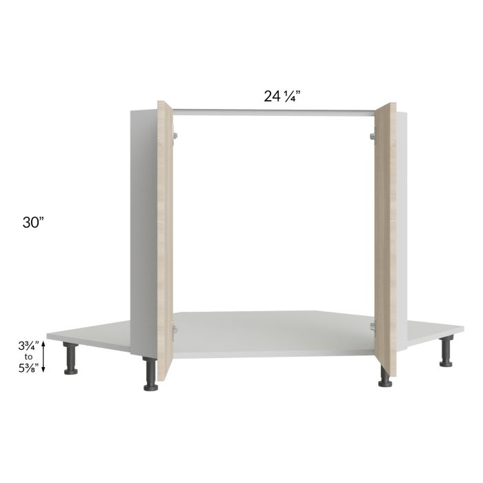 Full height door diagonal corner sink front that will take up 42" of wall space from the corner out, on each wall, once installed. There will be 2 doors, each measuring 12-1/16" wide, which use 45-degree hinges with Blumotion soft close. It will include the sink front floor as well as four black, adjustable, plastic furniture feet will also be included which will add 3-3/4" to 5-3/8" to the 30" height. No shelves will be included.