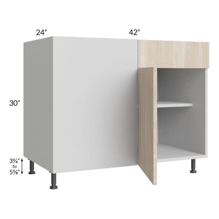 1 door blind base corner cabinet with 1 drawer and (1) 18" deep shelf. The drawer front height is 6-3/4". The actual width is 42", but the cabinet must be pulled at least 6" from the corner, taking up 48" of wall space. It can be pulled a max of 9", taking up 51" of wall space. The door width is 20-7/8" and the blind opening width is 20-11/32". A filler must be used between the blind and the adjacent cabinet so the doors and drawers are able to open without interference. The filler must be purchased separately. Black, adjustable, plastic furniture feet will also be included which will add 3-3/4" to 5-3/8" to the 30" height.