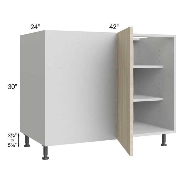 1 full height door blind base corner cabinet with no drawers and (2) 18" deep shelves. The actual width is 42", but the cabinet must be pulled at least 6" from the corner, taking up 48" of wall space. It can be pulled a max of 9", taking up 51" of wall space. The door width is 20-7/8" and the blind opening width is 20-11/32". A filler must be used between the blind and the adjacent cabinet so the doors and drawers are able to open without interference. The filler must be purchased separately. Black, adjustable, plastic furniture feet will also be included which will add 3-3/4" to 5-3/8" to the 30" height.