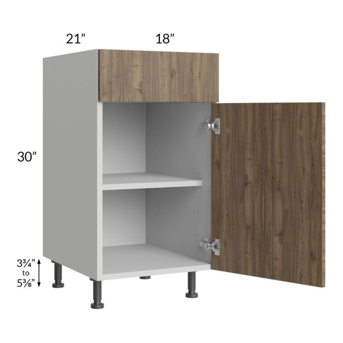 Vanity base cabinet with (1) door, (1) drawer, and (1) 18" deep shelf. The drawer front is 6-3/4" high. Black, adjustable, plastic furniture feet will also be included which will add 3-3/4" to 5-3/8" to the 30" height.