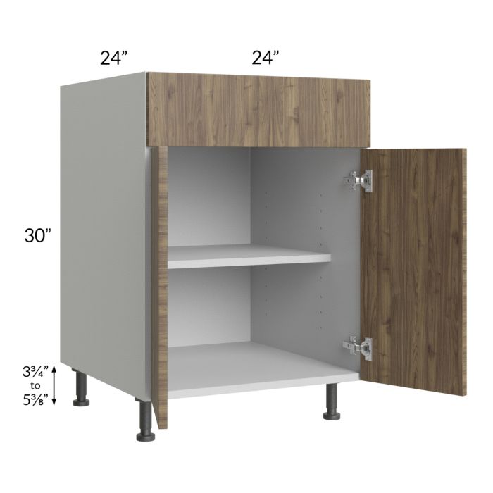 2 door base cabinet with (1) 18" deep adjustable shelves and 1 drawer. Black, adjustable, plastic furniture feet will also be included which will add 3-3/4" to 5-3/8" to the 30" height.