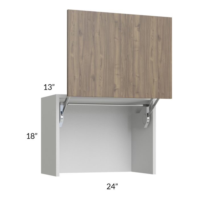 Wall appliance cabinet that is meant to sit on the countertop to hide appliances, it will have an open floor and no bottom rail. It features Blum Lift-Up & Away Hinges to allow the door to lift up and away from the face frame of the cabinet. It will be shipped with a support bracket to be removed before cabinet installation.