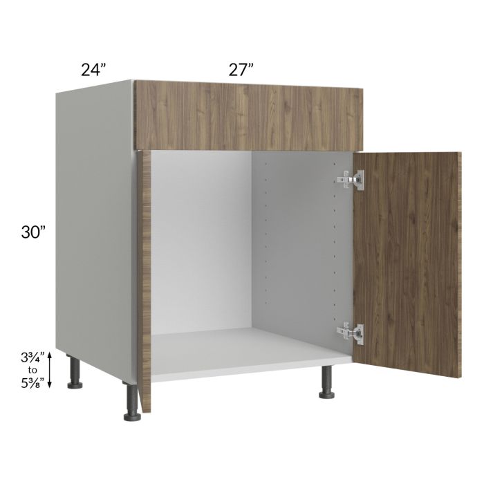 Sink base cabinet with 2 doors and (1) 6-3/4" false drawer front. This cabinet will have no shelves (the sides will come pre-drilled with shelf clip holes if loose shelves are needed - which need to be purchased separately). Black, adjustable, plastic furniture feet will also be included which will add 3-3/4" to 5-3/8" to the 30" height.