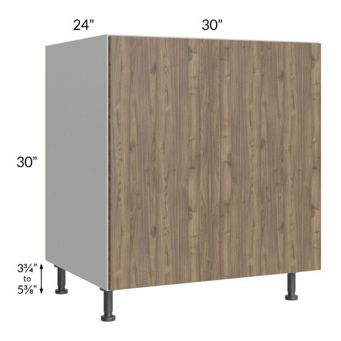 Base oven cabinet. The front panel is attached with clips for easy removal and install. Once removed, the opening will need to be cut, the maximum it can be cut is 28-1/2"W x 28-1/2"H, then the panel will be reattached back onto the cabinet. To avoid damage to the frame and side panels, please apply extra care when cutting the front panel, blue masking tape is the most commonly used to avoid splintering (strong adhesives must be avoided to avoid pulling the finish off). Black, adjustable, plastic furniture feet will also be included which will add 3-3/4" to 5-3/8" to the 30" height. *A heat shield will need to be used on both sides of an oven base cabinet or range-top base cabinet to shield the adjacent cabinet boxes from the oven heat. This can be added from the 'View Options' area for this cabinet. Each heat shield will be 30" high and can be cut to size, as needed (sold in quantities of 1, a quantity of 2 must be ordered to receive 2 heat shields).*