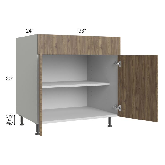 2 door base cabinet with (1) 18" deep adjustable shelves and 1 drawer. Black, adjustable, plastic furniture feet will also be included which will add 3-3/4" to 5-3/8" to the 30" height.