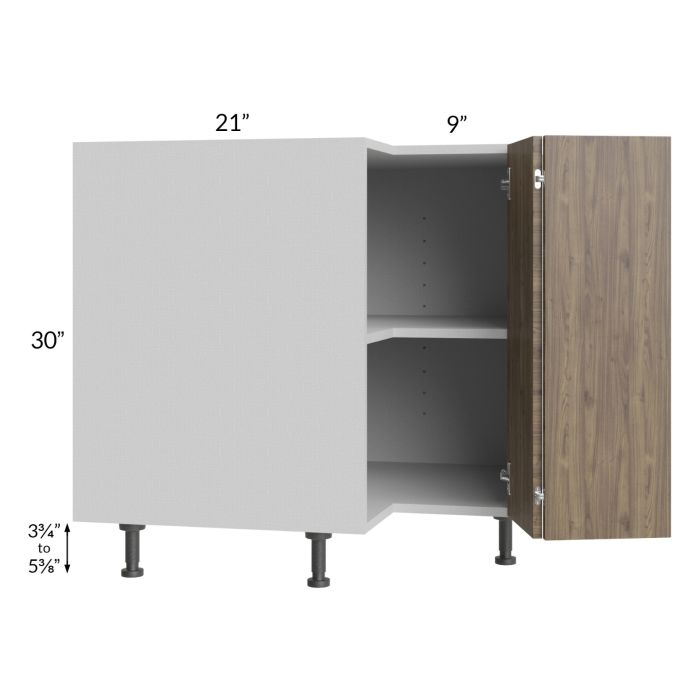 Easy reach corner cabinet that will take up 33" from the corner out, on each wall. It comes with one adjustable shelf and will not have soft close hinges. The cabinet will have a 21" depth for an easier installation, however due to the smaller depth, it must be pulled out 3" off both walls (thus, taking up 24" of wall space on each wall). This gap will not be visible once countertops are installed. Once assembled, the door cannot be reversed, so be sure to specify left or right hinging (as if facing the cabinet). Black, adjustable, plastic furniture feet will also be included which will add 3-3/4" to 5-3/8" to the 30" height.