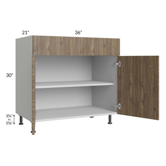 Vanity base cabinet with (2) doors, (1) drawer, and (1) 18" deep shelf. The drawer front is 6-3/4" high. Black, adjustable, plastic furniture feet will also be included which will add 3-3/4" to 5-3/8" to the 30" height.