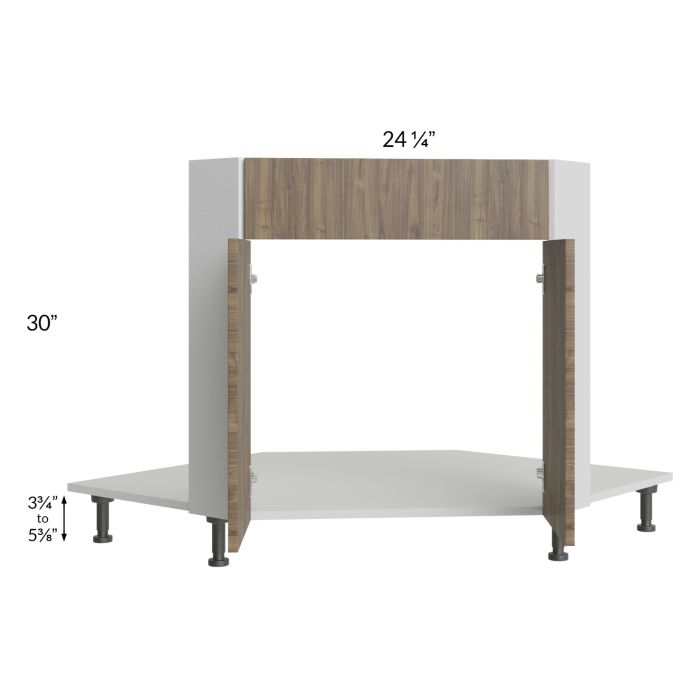 Diagonal corner sink front that will take up 42" of wall space from the corner out, on each wall, once installed. There will be 2 doors, each measuring 12-1/16" wide, which use 45-degree hinges with Blumotion soft close. The false drawer front is 6-3/4" high. It will include the sink front floor as well as four black, adjustable, plastic furniture feet will also be included which will add 3-3/4" to 5-3/8" to the 30" height. No shelves will be included.