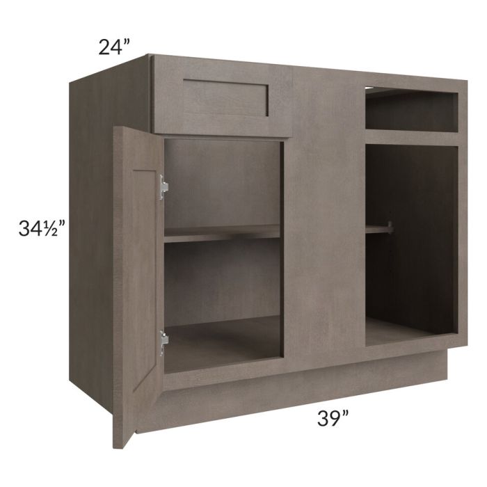 1 door blind base corner cabinet. The actual width is 39" however it will take up a minimum of 42" of wall space and can be pulled up to 45". This cabinet has 1 drawer and is reversible. The door/drawer width is 14-9/16”, blind opening is 11 7/8”. The drawer and door opening will be 3" less than the width of the door and drawer front. A filler will be needed between the blind and adjacent cabinet to ensure the drawer and door open properly; the filler must be purchased separately.