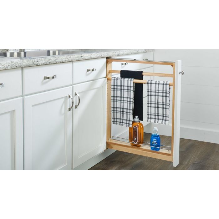 Looking for a better way to store hand towels and cleaning supplies in the kitchen? Look no further than the new Filler Organizer, featuring natural maple construction, full-extension, ball-bearing slides with soft-close, two towel bars and a static shelf with chrome wire accents. Filler matching the cabinets needs to be ordered separately.