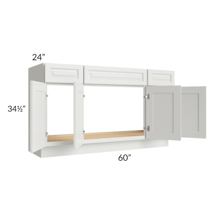 4 door sink base cabinet with 1 functioning drawers on either end and 1 false drawer front across the middle. The drawer fronts and doors on the side are 14-3/4"W and the false drawer front and 2 doors in the middle are 29-1/2"W.