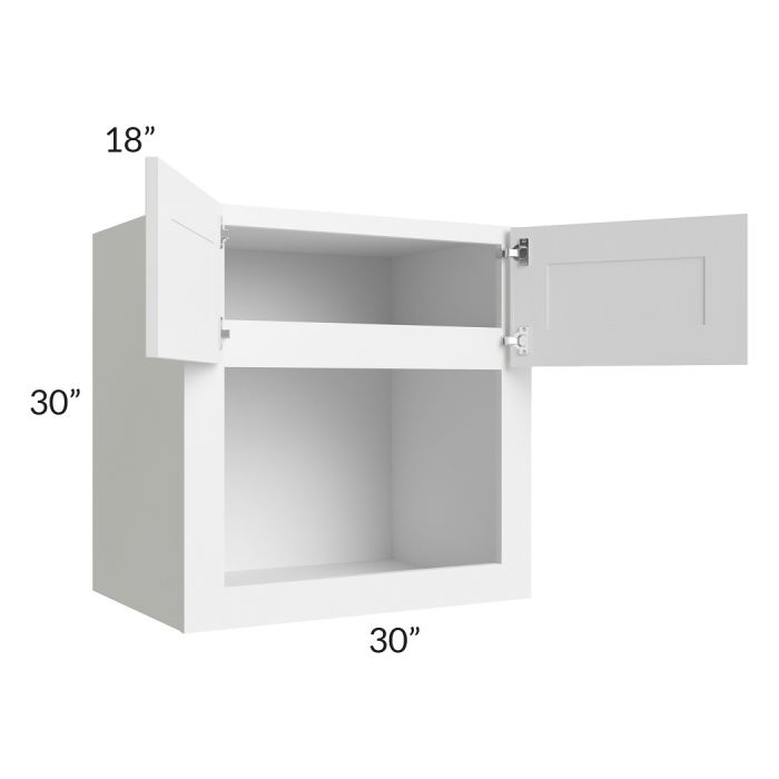 Microwave cabinet that has an opening dimension of 26-7/8"W x 18-1/2"H and a shelf depth of 20". There are no upper shelves behind the doors above the opening. *Please note this cabinet has a depth of 18"*