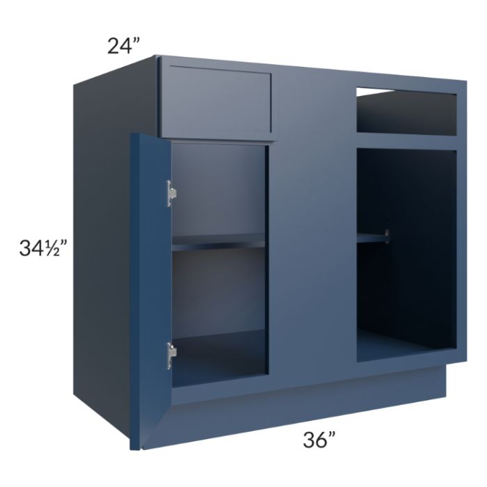 1 door blind base corner cabinet. The actual width is 36" however it will take up a minimum of 39" of wall space and can be pulled up to 42". This cabinet has 1 drawer and is reversible. The door/drawer width is 11-9/16, blind opening is 8-7/8. The drawer and door opening will be 3" less than the width of the door and drawer front. A filler will be needed between the blind and adjacent cabinet to ensure the drawer and door open properly; the filler must be purchased separately.