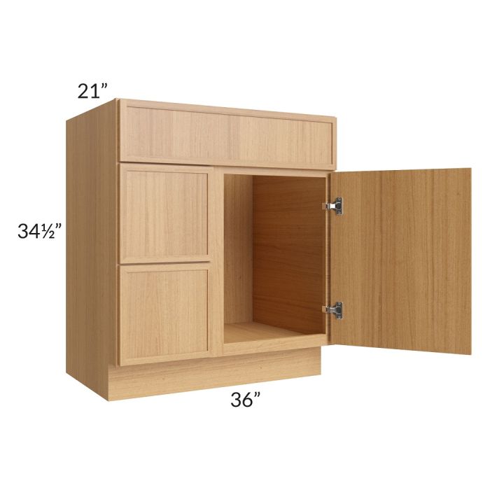 Bathroom vanity that has 1 door on the right, 1 fake drawer front on top, and 2 drawers on the left.