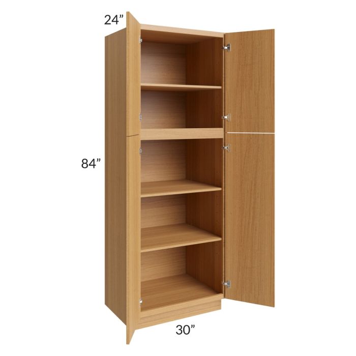 Wall pantry cabinet that has 4 doors, 2 smaller doors on top and 2 larger doors on bottom. This pantry cabinet comes with 1 fixed shelf and 3 adjustable shelves. There is no center stile. Measurements are as follows: Top/Middle/Bottom door width is 11-11/16". Top door height is 29-5/16". Middle/Bottom door height is 49-1/4".