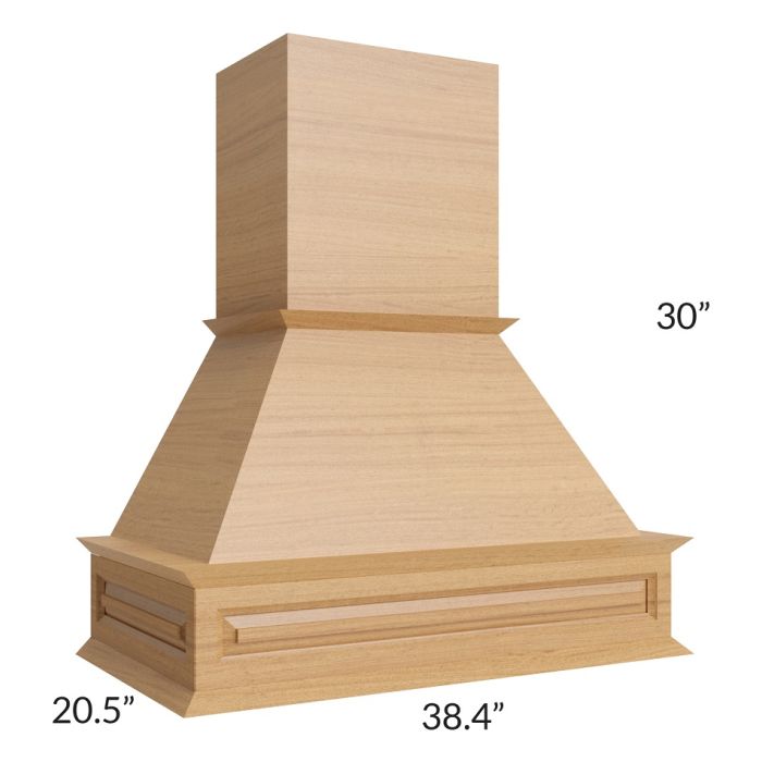 Wood range hood with no decorative rail. The top 30" is trim-able if needed. The hood is 38-3/8" at widest point of base. This is for an actual hood, not a hood cover and a separate liner and blower will be needed.