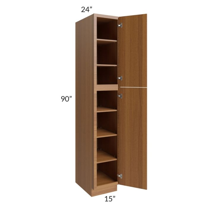 Wall pantry cabinet with 2 doors, 1 smaller door on top and 1 larger door on bottom. This pantry cabinet comes with 1 fixed shelf and 5 adjustable shelves. Measurements are as follows: Top/Middle/Bottom door width = 14 1/2". Top door height = 35 5/16". Middle/Bottom door height = 49 1/4".