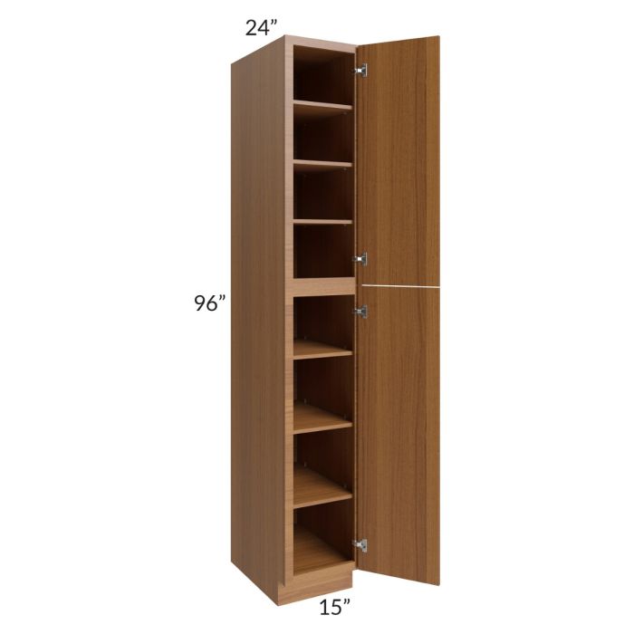 Wall pantry cabinet with 2 doors, 1 smaller door on top and 1 larger door on bottom. This pantry cabinet comes with 1 fixed shelf and 6 adjustable shelves. Measurements are as follows: Top/Middle/Bottom door width is 14-1/2". Top door height is 4-5/16". Middle/Bottom door height is 49-1/4".