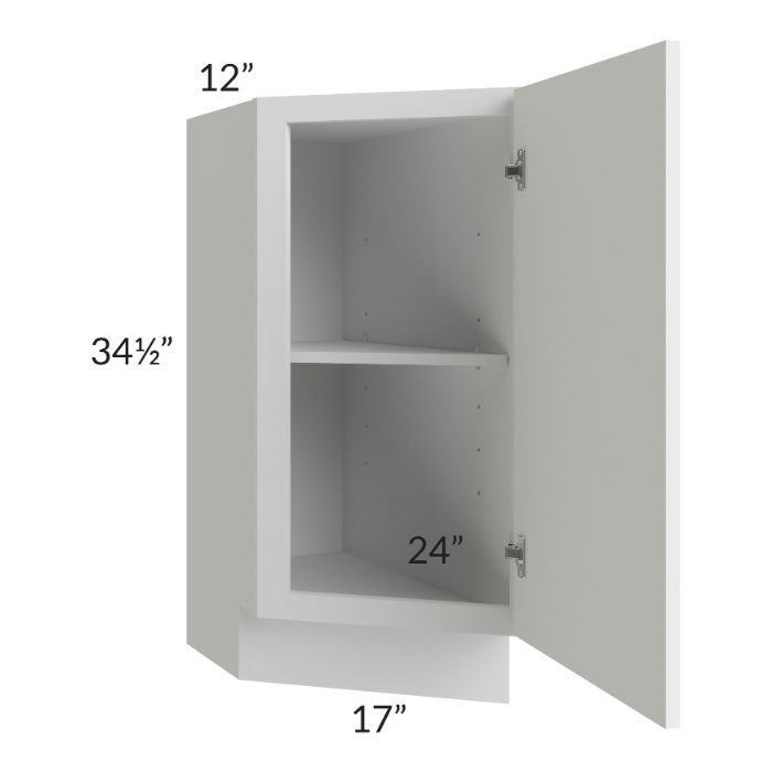 Full height door cabinet that is meant to be used at the end of a cabinet run. It will have a 24" deep side on the right which gets installed against the adjacent cabinet. The door is angled and the exposed side of the cabinet (on the left) will be 12" deep. Comes with 1 shelf.
