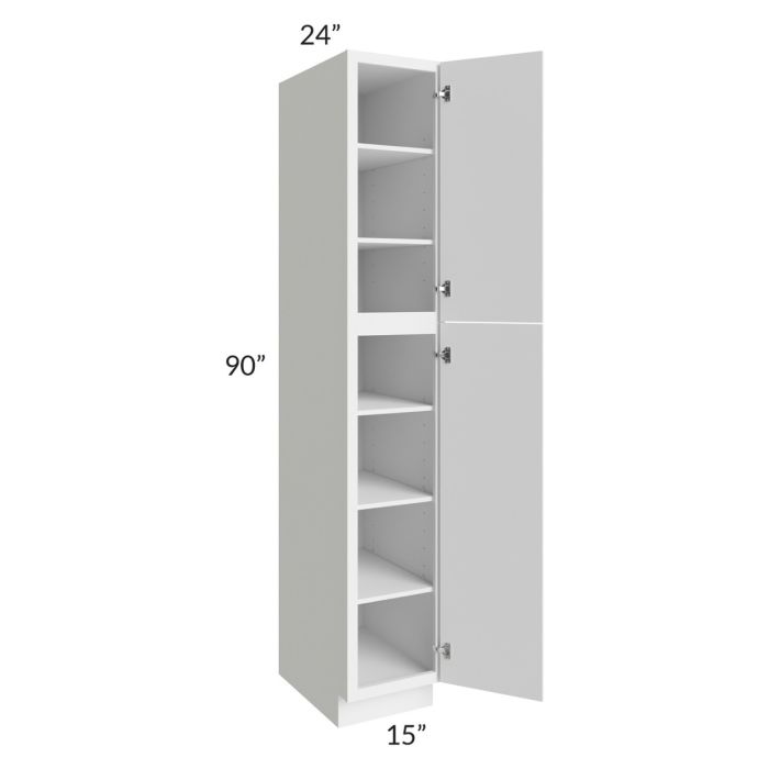 Wall pantry cabinet with 2 doors, 1 smaller door on top and 1 larger door on bottom. This pantry cabinet comes with 1 fixed shelf and 5 adjustable shelves. Measurements are as follows: Top/Middle/Bottom door width = 14 1/2". Top door height = 35 5/16". Middle/Bottom door height = 49 1/4".