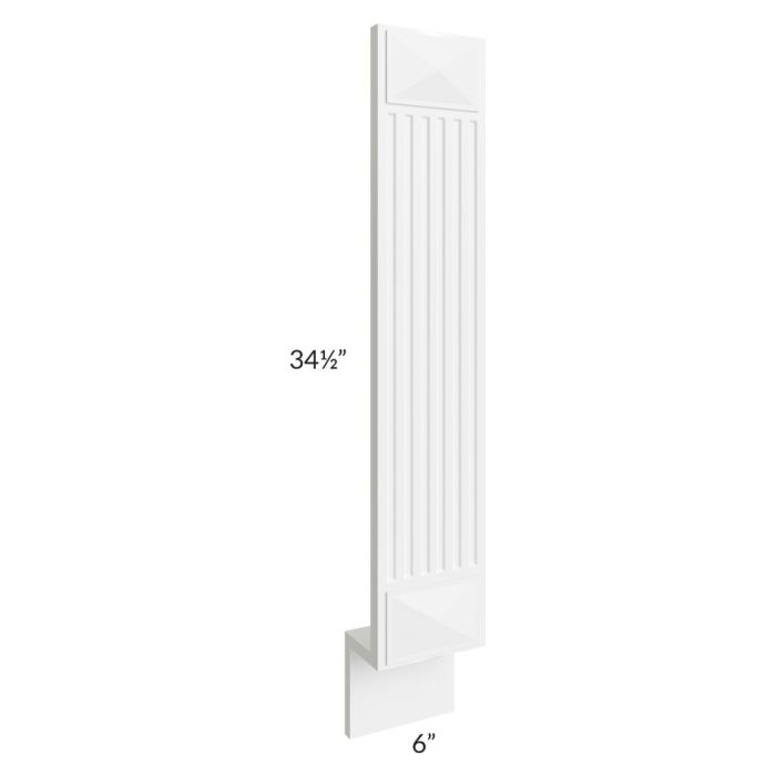 Fluted decorative base filler with rosette. Commonly used to fill gaps between cabinets and gaps between cabinets and appliances.