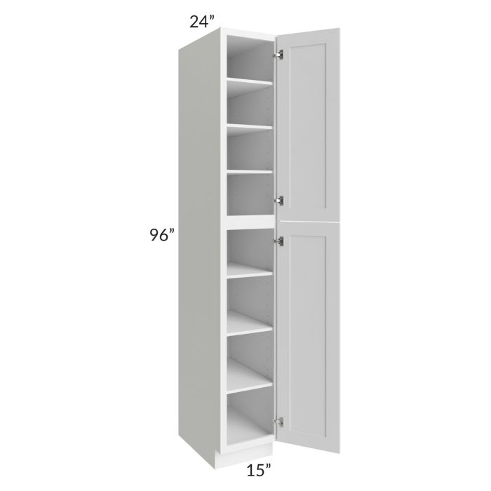 Wall pantry cabinet with 2 doors, 1 smaller door on top and 1 larger door on bottom. This pantry cabinet comes with 1 fixed shelf and 6 adjustable shelves. Measurements are as follows: Top/Middle/Bottom door width is 14-1/2". Top door height is 41-5/16". Middle/Bottom door height is 49-1/4".