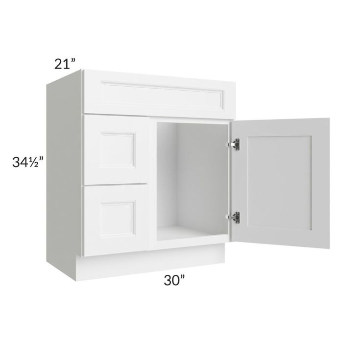 Bathroom vanity that has 1 door on the right, 1 fake drawer front on top, and 2 drawers on the left.