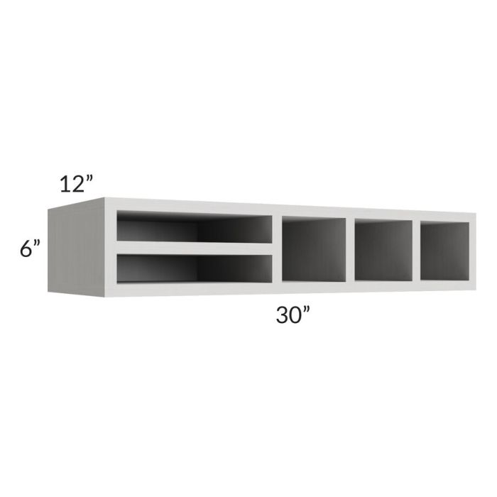 Organizer cabinet with wood veneer edge banding and a finished interior. There will be 2 horizontal shelving areas on the left which measure approximately 11-1/8"W x 2"H, and 3 vertical storage areas on the right which measure approximately 5-1/4"W x 4-3/4"H.