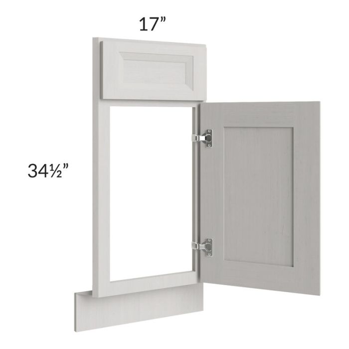 Diagonal corner sink front that will take up 36" of wall space from the corner out, on each wall, once installed. The door width is 14-1/2" and the face frame width is 17". This cabinet will have a partial overlay door to ensure it opens without hitting the adjacent cabinet, so there will be about 1-1/8" of face frame, visible on either side of the door. The corner sink front floor must be ordered separately (SKU DSFL36).