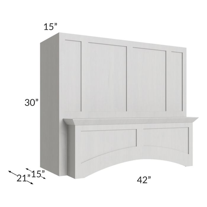 Arched wood hood with an overall depth of 21", the depth of the main part of the hood (which goes against the wall) is 15". The top panel will lift up and the sides will be flush. If crown is being installed, it would be installed above the cabinet, not on the face frame. A full interior stainless steel hood liner will also be installed (liner can be removed on site, if needed, however a hood liner is strongly recommended to prevent the wood hood from getting burned and is required by code in many places. The interior hood liner dimensions are as follows:
