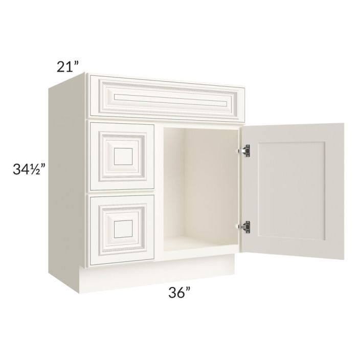 Bathroom vanity that has 1 door on the right, 1 fake drawer front on top, and 2 drawers on the left.