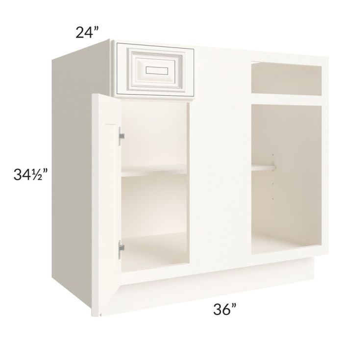 1 door blind base corner cabinet. The actual width is 36" however it will take up a minimum of 39" of wall space and can be pulled up to 42". This cabinet has 1 drawer and is reversible. The door/drawer width is 11-9/16”, blind opening is 8 7/8”. The drawer and door opening will be 3" less than the width of the door and drawer front. A filler will be needed between the blind and adjacent cabinet to ensure the drawer and door open properly; the filler must be purchased separately.