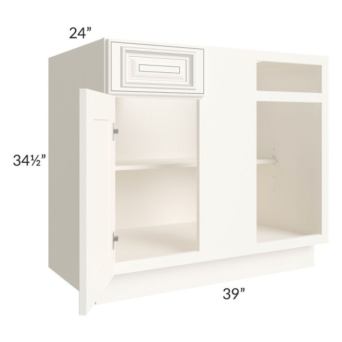 1 door blind base corner cabinet. The actual width is 39" however it will take up a minimum of 42" of wall space and can be pulled up to 45". This cabinet has 1 drawer and is reversible. The door/drawer width is 14-9/16”, blind opening is 11 7/8”. The drawer and door opening will be 3" less than the width of the door and drawer front. A filler will be needed between the blind and adjacent cabinet to ensure the drawer and door open properly; the filler must be purchased separately.