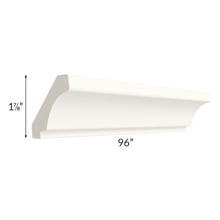 Crown molding that comes in an 8 foot strip. Commonly used to finish the top of wall cabinets. Once installed, the crown will stick out about 1-5/8" from the cabinet and the height off the cabinet will be about 1-7/8".