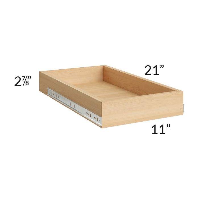 Roll out tray to be used with a 15" wide base cabinet or a 15" wide pantry cabinet . The roll out tray will come pre-assembled, dovetailed, and have a soft close full extension track. They are solid birch with a dove maple finish.