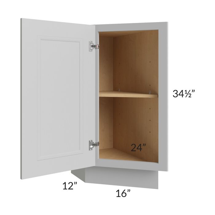 Full height door cabinet that is meant to be used at the end of a cabinet run. It will have a 24" deep side on the right which gets installed against the adjacent cabinet. The door is 16" wide and angled. The exposed side of the cabinet (on the left) will be 12" deep. The door will always be hinged on the 12" deep side.