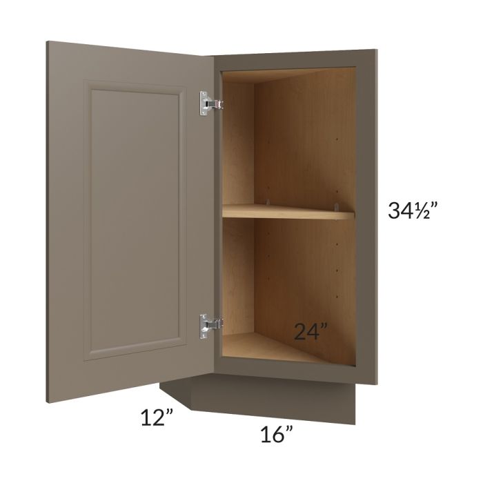 Full height door cabinet that is meant to be used at the end of a cabinet run. It will have a 24" deep side on the right which gets installed against the adjacent cabinet. The door is 16" wide and angled. The exposed side of the cabinet (on the left) will be 12" deep. The door will always be hinged on the 12" deep side.
