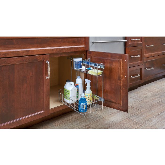 Keep items stored away in this easy to reach sink base pullout. Features include right or left hand mounting, door mountable chrome frame and ball-bearing slides. The unit will mount to the cabinet side and requires a minimum opening of 10". *This item is a special order and is not returnable*