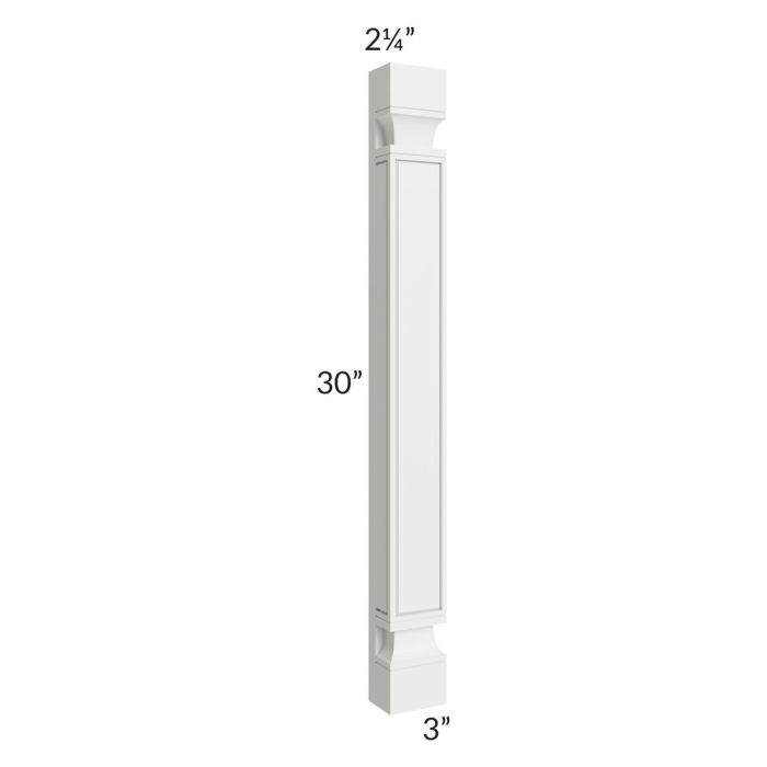 Wall plain pilaster. The filler the pilaster is mounted on is 3/4" deep, the pilaster itself is 1-1/2" deep. Top and bottom sections above and below the pilaster are each 2" tall. 2" will need to be trimmed from the top or bottom before installation. **Pilasters are handmade and may therefore feature inconsistencies in shape or form. These are in no way considered defects**