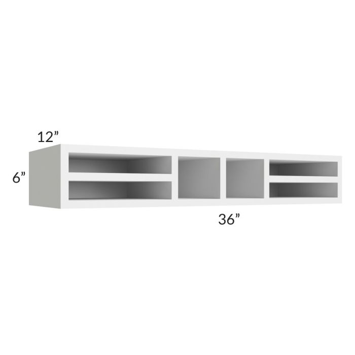 Organizer cabinet with wood veneer edge banding and a finished interior. There will be 2 horizontal shelving areas on either end which measure approximately 11-1/8"W x 2"H, and 2 vertical storage areas in the middle which measure approximately 5-1/4"W x 4-3/4"H.