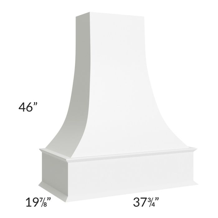 Curved wood hood that can be trimmed on top, if needed. Measurements without moldings are 36"W x 19"D. The bottom apron measures 8"H and the total hood height is 46'". The top of the hood is 17"W x 9-1/2"D.
