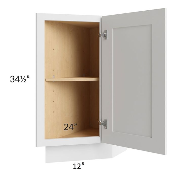 Full height door cabinet that is meant to be used at the end of a cabinet run. It will have a 24" deep side on the left which gets installed against the adjacent cabinet. The door is angled and the exposed side of the cabinet (on the right) will be 12" deep. Comes with 1 shelf.