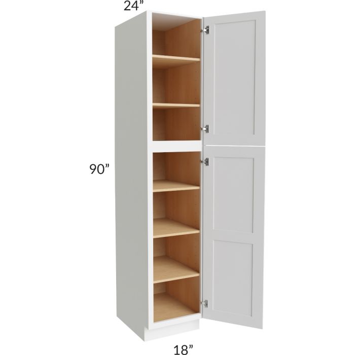 Wall pantry cabinet with 2 doors, 1 smaller door on top and 1 larger door on bottom. This pantry cabinet comes with 1 fixed shelf and 5 adjustable shelves. Measurements are as follows: Top/Middle/Bottom door width is 17-9/16". Top door height is 35-5/16". Middle/Bottom door height is 49-1/4". There will be a horizontal decorative stile across the bottom pantry door.