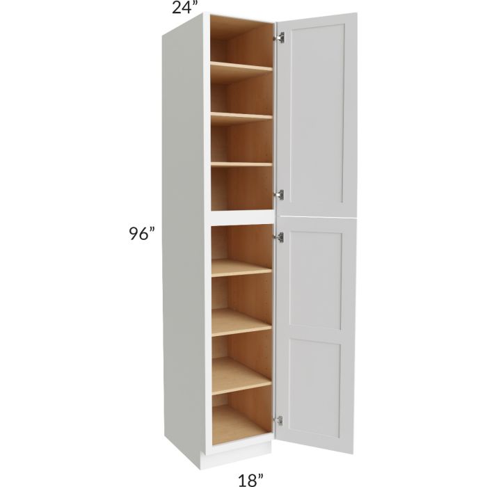 Wall pantry cabinet with 2 doors, 1 smaller door on top and 1 larger door on bottom. This pantry cabinet comes with 1 fixed shelf and 6 adjustable shelves. Measurements are as follows: Top/Middle/Bottom door width is 17-9/16". Top door height is 41-5/16". Middle/Bottom door height is 49-1/4". There will be a horizontal decorative stile across the bottom pantry door.