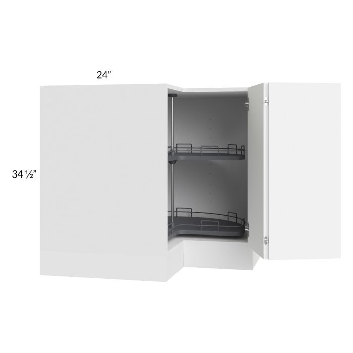 Corner base cabinet that comes with (1) adjustable shelf and will take up 33" from the corner out, on each wall. Metal rotating shelves can be purchased separately to use the cabinet as a Lazy Susan (SKU: BLSTRAY), 2 rotating trays will come with each order of the BLSTRAY.
