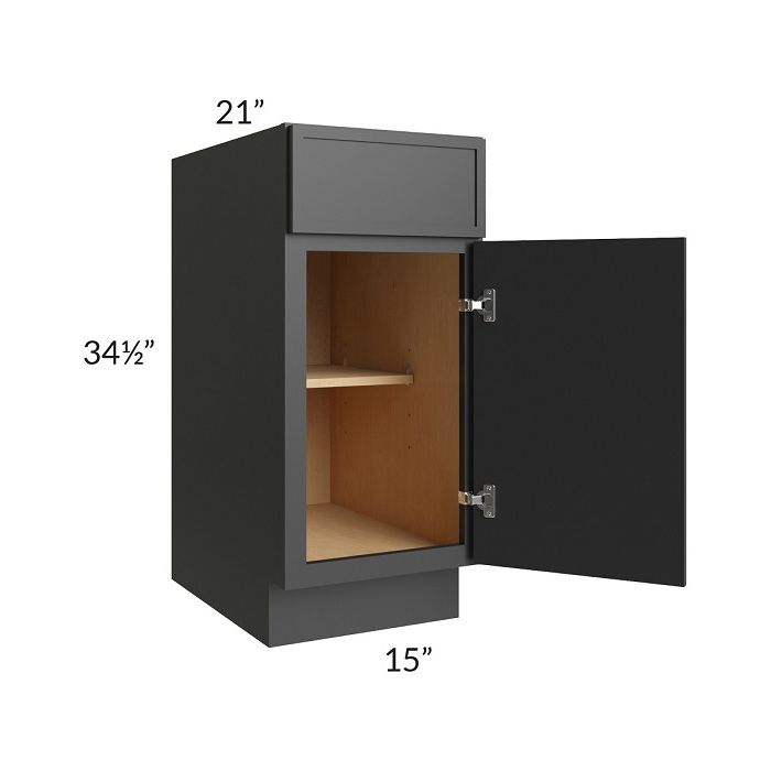 Vanity base cabinet with (1) door, (1) drawer, and (1) 15" deep shelf. There will be a 2" clearance between the drawer and back panel. The drawer front is 6-3/4" high.