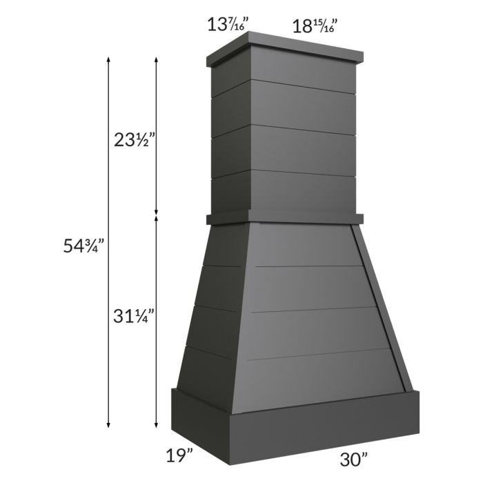 Farmhouse style wood hood that comes with a stainless steel liner. The chimney height of 23-1/2" can be trimmed on site, if needed. Blower is not included and would need to be purchased separately. The chimney depth is 13-7/16" and the width is 18-15/16".