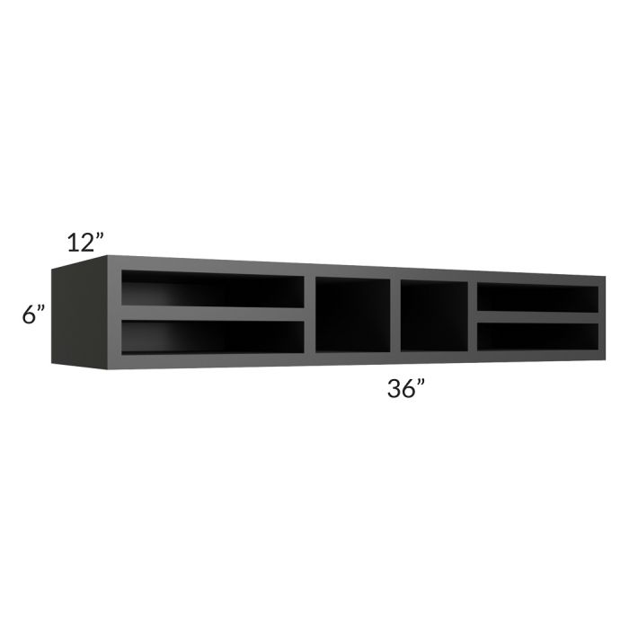 Organizer cabinet with wood veneer edge banding and a finished interior. There will be 2 horizontal shelving areas on either end which measure approximately 11-1/8"W x 2"H, and 2 vertical storage areas in the middle which measure approximately 5-1/4"W x 4-3/4"H.