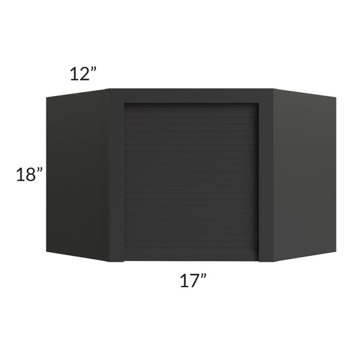 Appliance garage with a front width of 17". It will have a roll up, tambour door and is designed to fit under a 24x24 diagonal corner wall cabinet. The door opening is approximately 14" wide, the tambour door is partially inserted into the frame on either side.